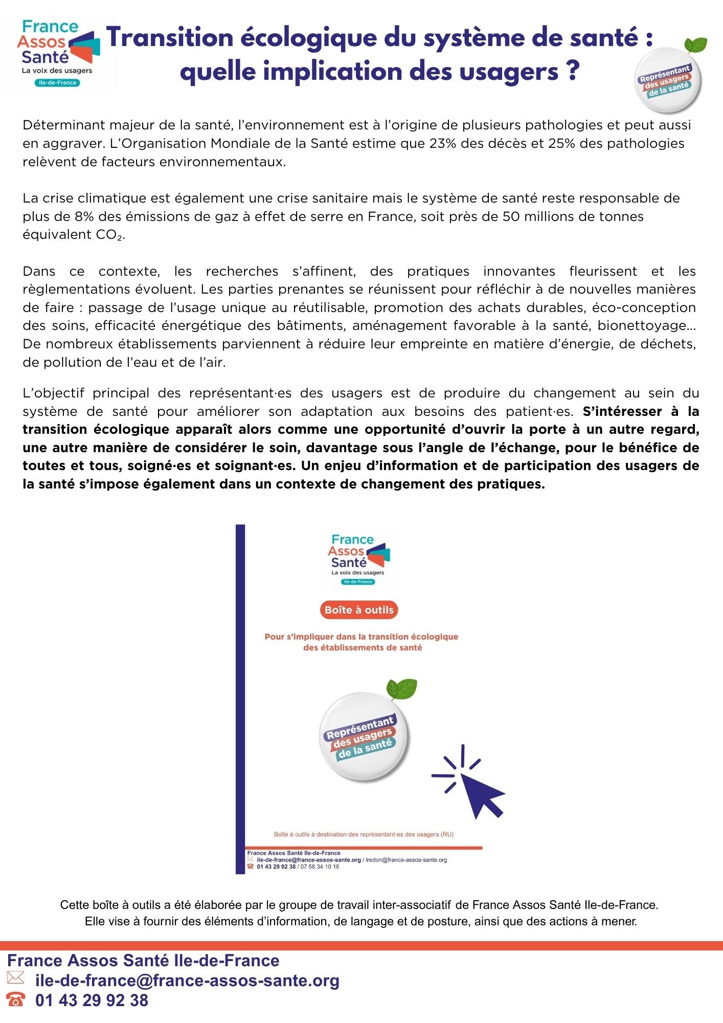 Le groupe de travail inter-associatif de France Assos Santé Ile-de-France qui travaille sur l’implication des usagers dans la transition écologique en santé a le plaisir de dévoiler au grand jour la